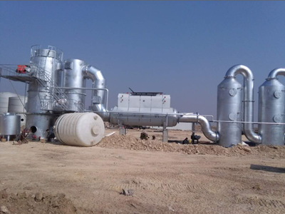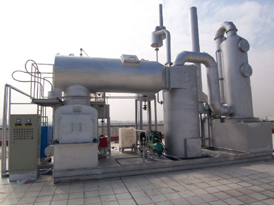 廢液和壓縮空氣經(jīng)管路控制系統(tǒng)進入霧化系統(tǒng),廢液霧化后噴入燃燒室,并依次通過迷宮除塵室和二次燃燒室,廢液中的有機物被焚燒,水分被蒸發(fā)。焚燒產(chǎn)生的高溫?zé)煔膺M入空氣換熱器,然后依次通過兩級急冷、吸附塔,煙氣中的微小粉塵及有害物質(zhì)(SO2、HCl等)被捕集吸收,經(jīng)處理后的干凈氣體由引風(fēng)機引入煙囪,排入大氣。